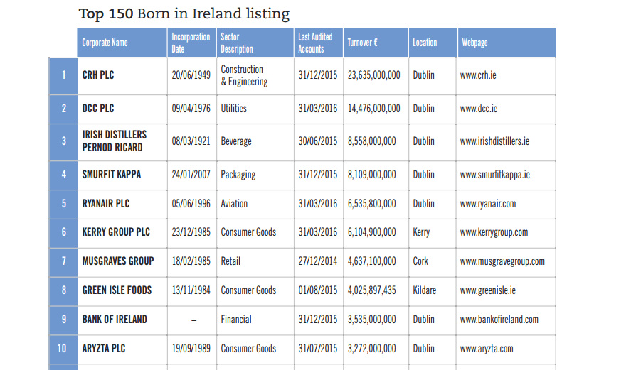 - Companies which started off as Irish owned but were taken over by larger non-Irish organisations have been excluded.